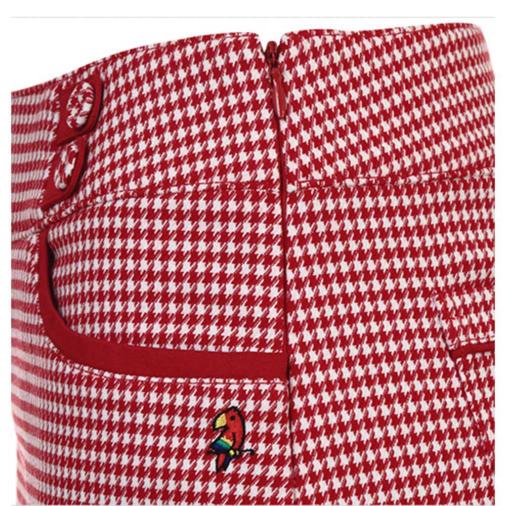 Váy golf nữ thương hiệu Macaw với sắc đỏ nổi bật cùng họa tiết caro trắng tương phản tạo nên sự tinh nghịch, trẻ trung và năng động cho các golfer